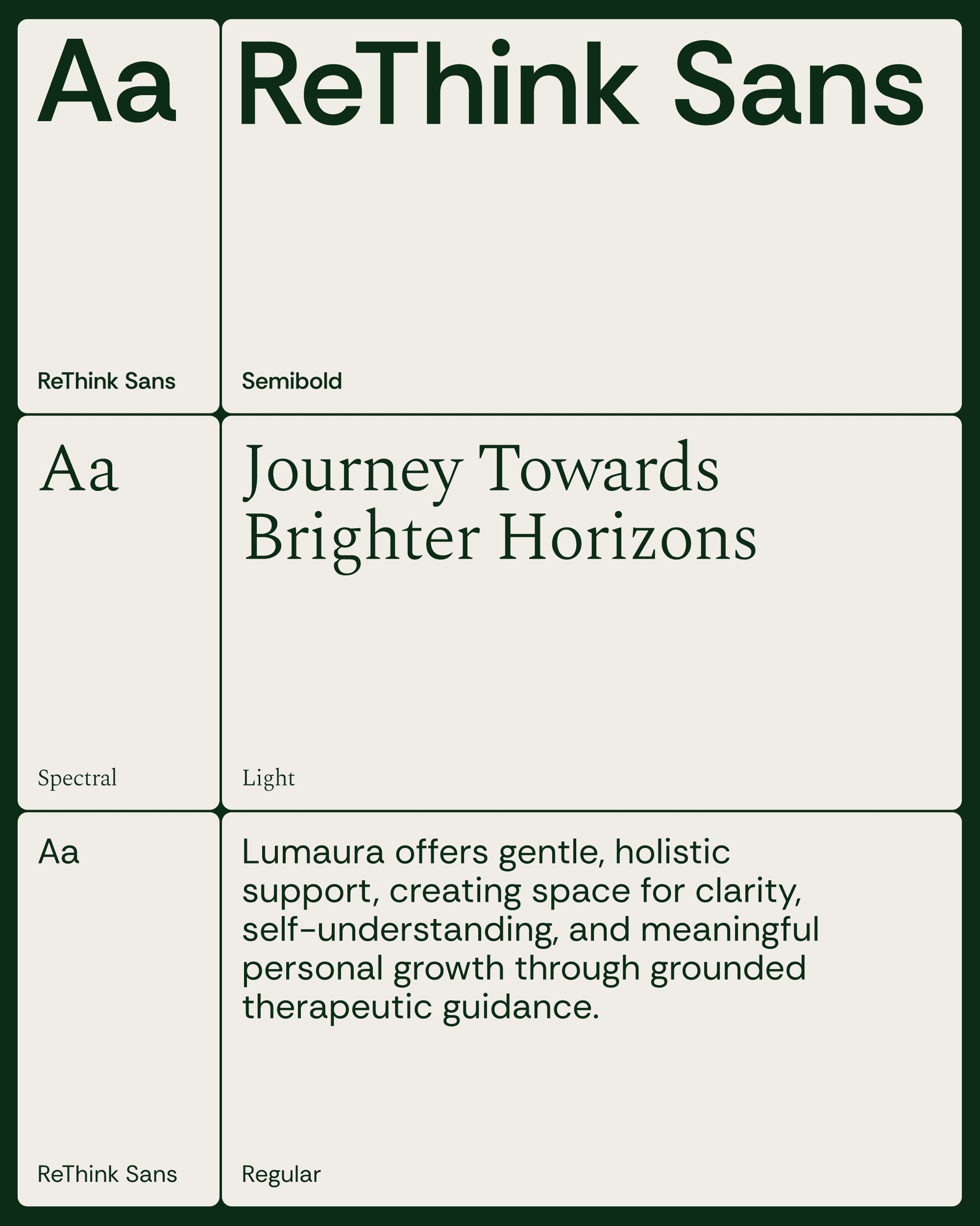 Lumaura is a psychology brand shaped to feel calm, warm and deeply human. The identity is built around clarity and emotional softness, reflecting the brand’s focus on personal growth and inner connection. Visual expression, language and structure balance professionalism with empathy — creating a space that feels safe, supportive and grounded for clients seeking guidance, healing and change.
